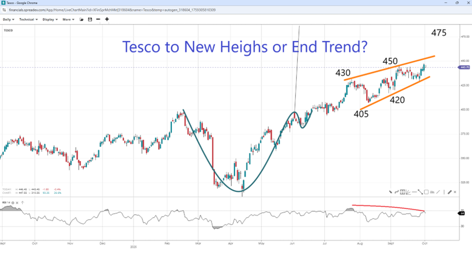 Tesco could be on its way to a new all-time high if it breaks out of its rising wedge pattern following repeated rejections at 445p. On the one hand, the longer timeframe shows a potential cup and handle, which brings into focus the measured move projection of 485p, just shy of the current ATH. Intermediate levels lie at 460p and 475p. On the other hand, if prices meet resistance at the upper wedge trendline near 450p, it could reverse the bullish trend, especially as momentum wanes on RSI. Support lies at 430p, the first wedge peak, followed by 420p and 405p, both swings of the pattern.