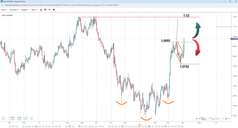 as markets remain nervous about the potential impact of US President Donald Trump's tariff policies on the economy and prices. A slowing economy, which would maintain pressure on the Fed to ease while inflation remains elevated, creates an ideal scenario for the dollar to weaken and gold prices to continue surging. As a result, on the back of a weaker dollar and the EU Commission's support measures in response to tariff announcements. However, now that the "Liberation Day" has passed, the market can shift its focus towards data that could underline whether the anticipated effects of the new policies are materialising.
