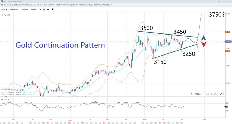 Gold rose on Tuesday, resuming its upward trend as the US Government budget for this year advanced through Congress. Platinum and palladium are also gaining as the large spending bill with a $5 trillion increase in the on top of tariff spending. All of this as the Fed gears up to lower rates, which typically make hard currencies more valuable, as well as support gold.