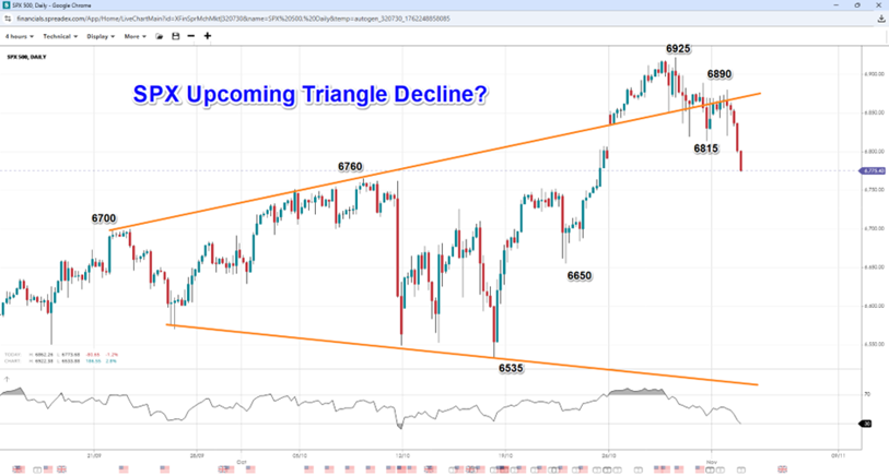 Price action in the US 500 has been bearish since the index peaked at 6925, with the breakdown under 6815 bringing prices back into the territory of an incomplete broadening triangle. If the market continues to decline, bears may challenge the 6760 and 6700 prior peaks, potentially leading to 6650 and the final triangle wave at 6535. On the flip side, if the index rebounds, it could render the triangle invalid, exposing new record highs if bulls can reclaim 6890, bringing the 7k into focus.