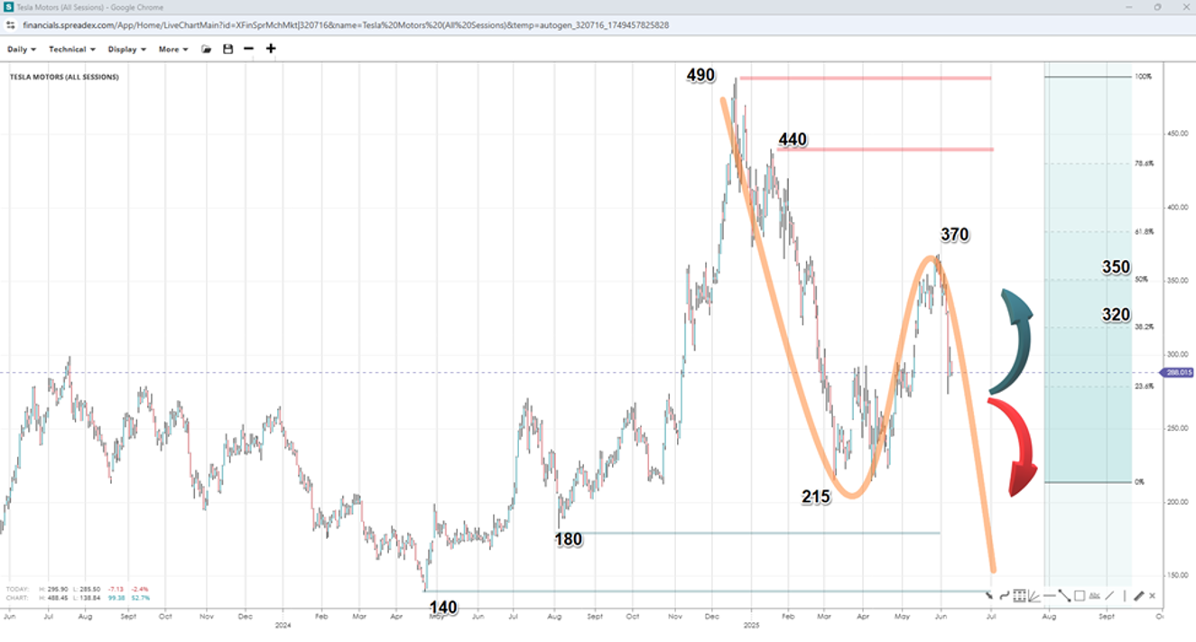 Technically, Tesla has bottomed out at $215 after forming a double bottom pattern in April. However, with prices stalling and reverting near the 50% Fibonacci of the $490-$215 leg at $370, this recovery could be a bull trap. Losing the regional floor would suggest a Dead-Cat-Bounce (DCB) pattern, opening the door to lower prices. Support below the $180 swing sits at the $140 level. To the upside, $320 and $350 appear as short-term resistance levels at the 38.2% and 50% Fibonacci, with a move past the peak invalidating the DCB pattern and eventually exposing $400, $440 and the market top.