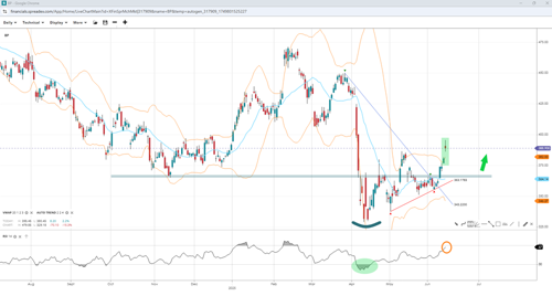 Interestingly, BP recently broke out of a range-bound market contained within the VWAP zone of 350-380 GBX, leaving behind support at 363, which coincides with the ‘autotrend’ resistance. The RSI suggests short-term upside potential at 67, bringing into focus the 400 round resistance unless momentum wanes under the VWAP high at 382. In that case, BP could revisit the bottom of the range near 346 and the ‘autotrend’ low of 343, opening the door to the swing low of 330. However, if BP continues its ascent, the next resistance lies at 425, followed by 450 and the peak of 470.