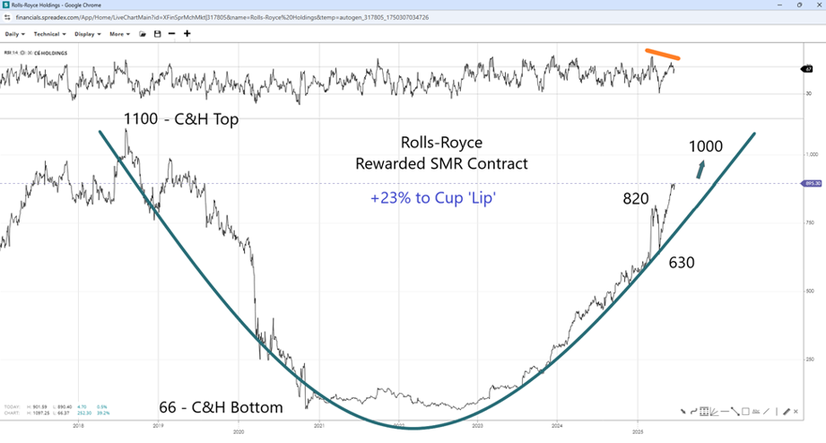 Rolls-Royce’s £2.5 billion contract award could benefit the company by meeting the surging demand for carbon-neutral energy from data centres. However, it faces competition from the US, which the Trump Administration is aggressively pursuing but has yet to approve any SMR proposals. Despite being at the forefront of development, Rolls-Royce says it won't be able to deliver its first reactor until 2032. Still, a potential Cup & Handle (C&H) formation might be at play, suggesting further upside potential.