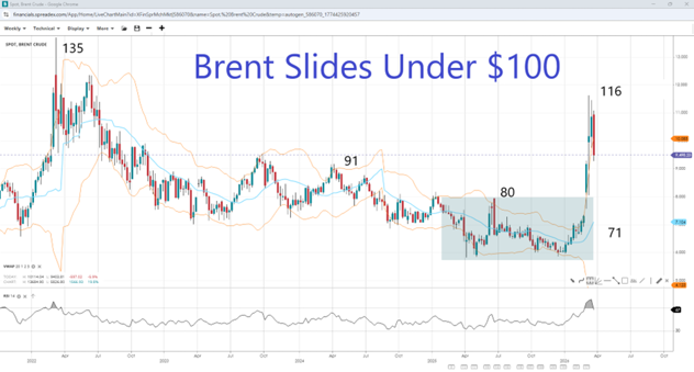 - Brent hovers around $100 per barrel as markets price in hopes of a diplomatic solution to the war.