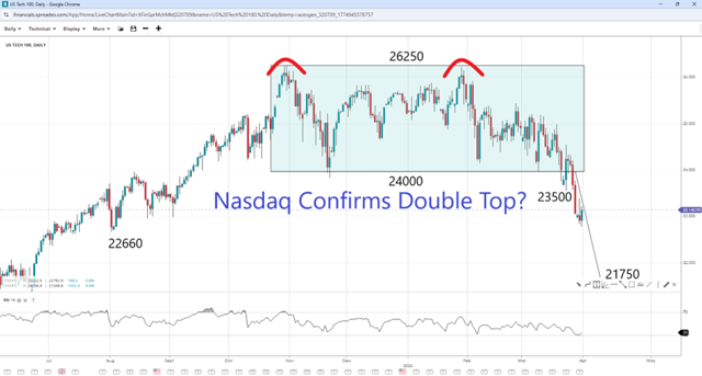 Following the peak at 26250 and subsequent move under the 24k support, the Nasdaq has confirmed a bearish breakout after trading for at least three sessions below support. Notably, the breakdown point appears to be the neckline support of a double top pattern, which often extends the height of the pattern that currently spans 2550 points. If the text-heavy US index fails to reclaim 23k and the 23500 swing support, the odds of sliding towards 21750 will increase, especially if 22660 gives way to bears. On the upside, bulls must reclaim the neckline support to make a respectable attempt to reverse the recent bearish course of the Nasdaq.