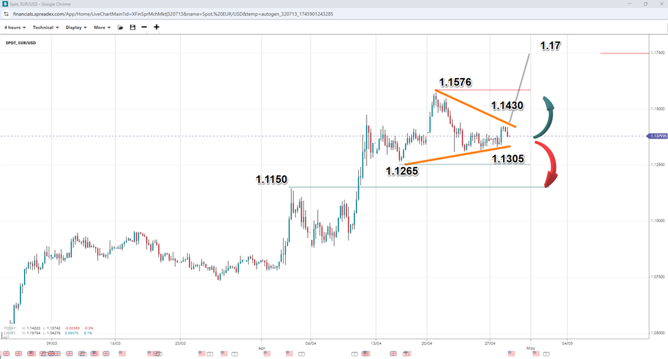The dollar decline, and in turn the gains seen in the EURUSD pair over the last couple of weeks, were largely attributed to faltering confidence in the US economy, stemming from the tariff issue. Still, with negotiations underway, the pair has seen a slight reversal to the downside, which could continue if tariffs are lifted.