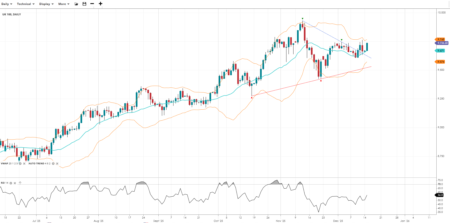UK 100 is in a bullish trend, currently testing the upper bounds of its corrective phase, trading at 9,737, above its VWAP of 9,671. The RSI at 56.8 indicates moderate momentum. Support is at 9,574, with resistance at 9,768.
