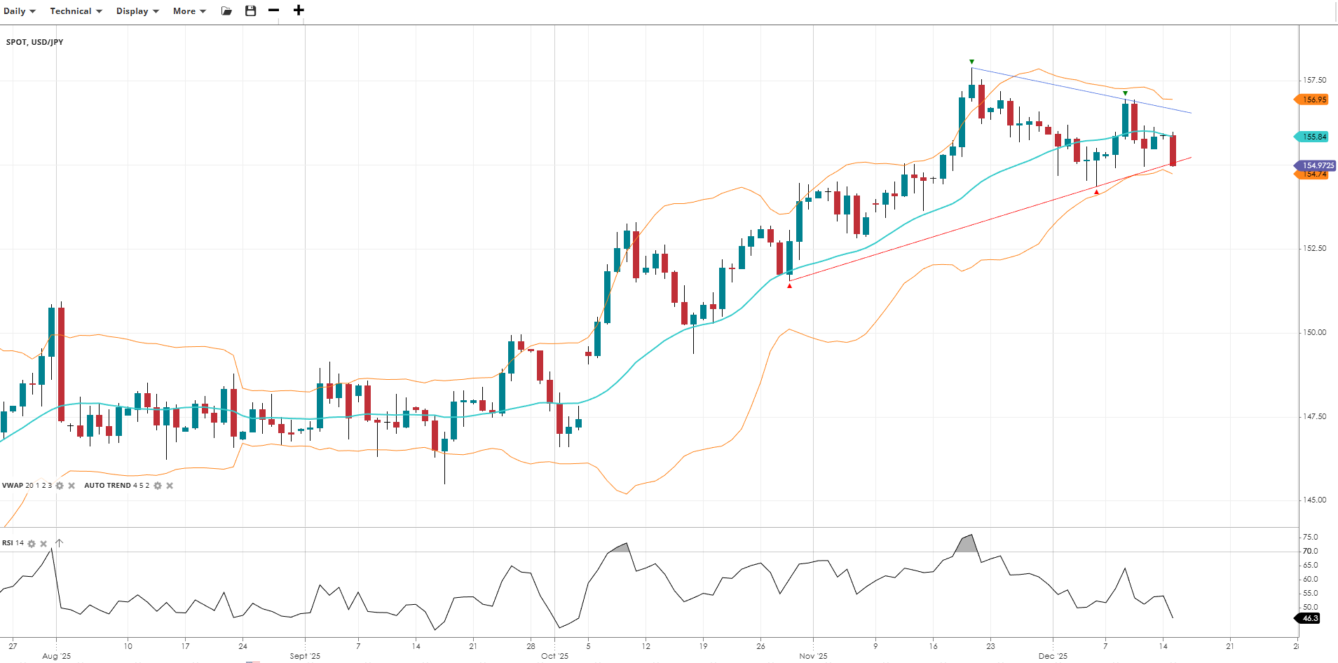 USD/JPY is in a correction of its bearish trend, currently in a correction phase, trading at 154.97, below its VWAP of 155.84. The RSI at 46.3 indicates subdued momentum. Support is at 154.74, with resistance at 156.95.