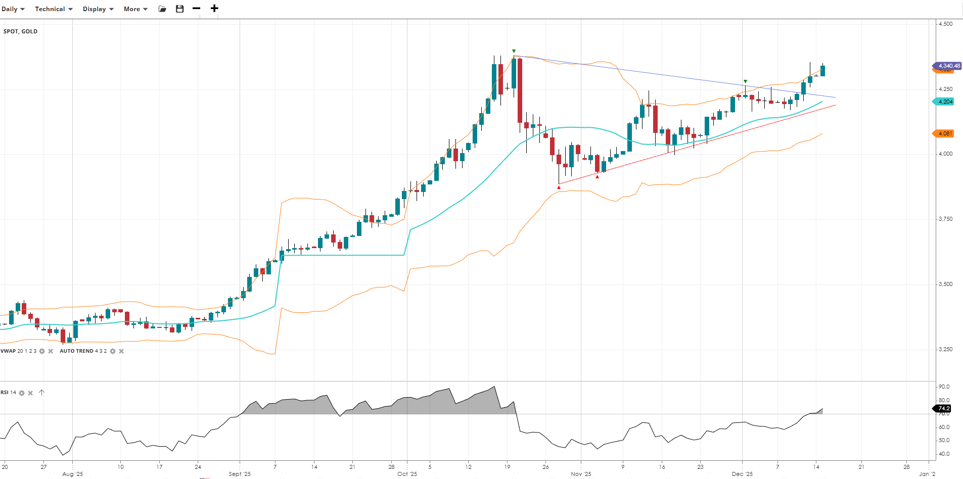 Gold is attempting an upside breakout, currently in a breakout phase, trading at 4,340, above its VWAP of 4,204. The RSI at 74.2 indicates strong momentum. Support is at 4,081, with resistance at 4,340.