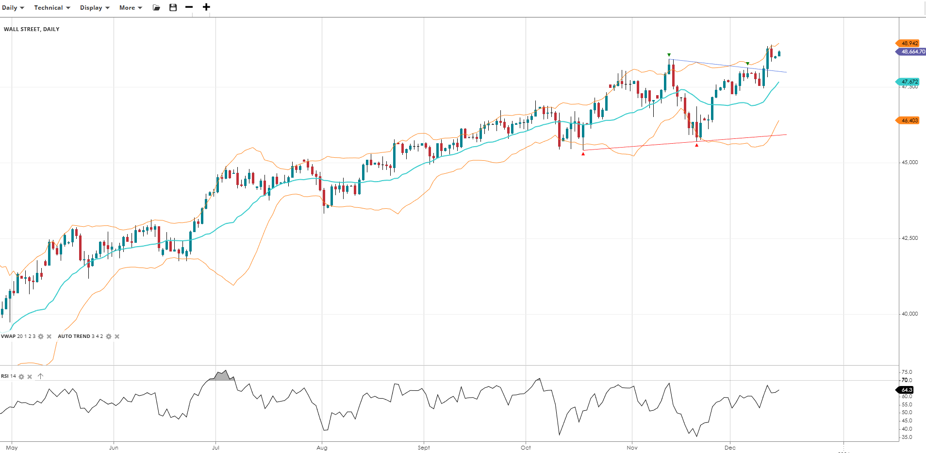 Wall Street continues in a bullish trend and is retesting all time highs after a breakout following its recent pullback, trading at 48,665, above its VWAP of 47,672. The RSI at 64.3 indicates strong momentum. Support is at 46,403, with resistance at 48,942.