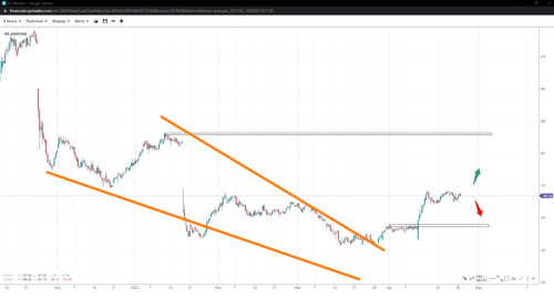 Dr. Martens might have finished a wedge pattern with its third leg down at $127 and has since soared higher. If the trend continues, it may take the stock price as high as the $215 mark should bulls capture the $200 handle. Conversely, if the local support at $160 fails, a deeper correction might develop, possibly inducing a descent toward $145.