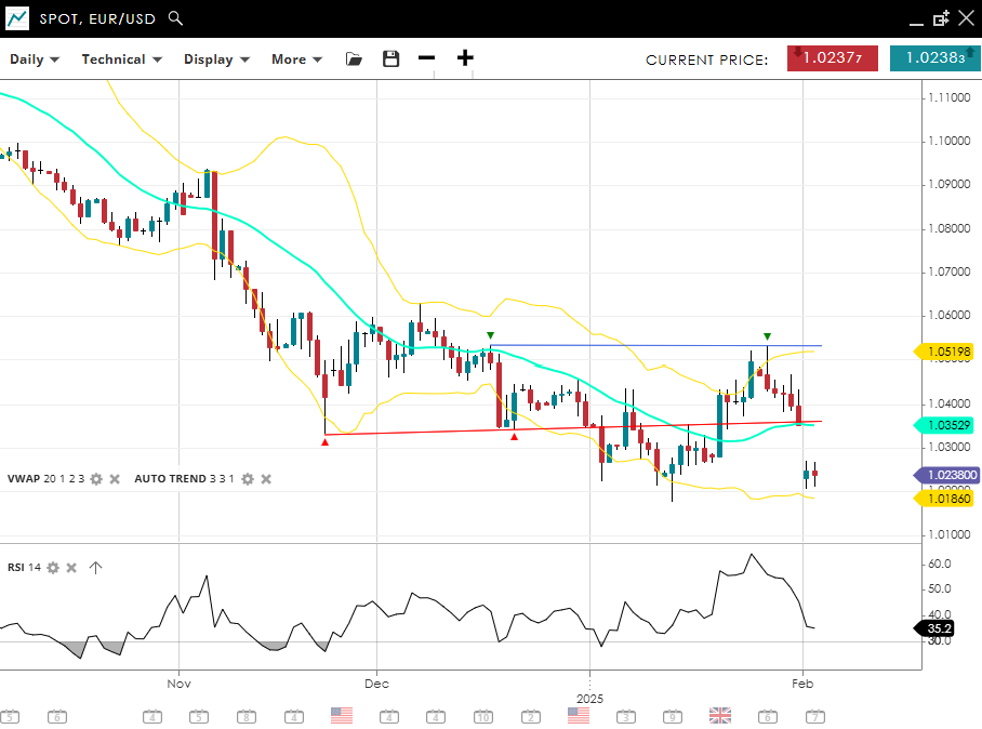 EUR/USD is back in an impulsive phase of its downtrend, trading at 1.0238, below its VWAP (20) of 1.0352. Support is holding at 1.0186, while resistance is established at 1.0519. With RSI at 35, bearish pressure persists.