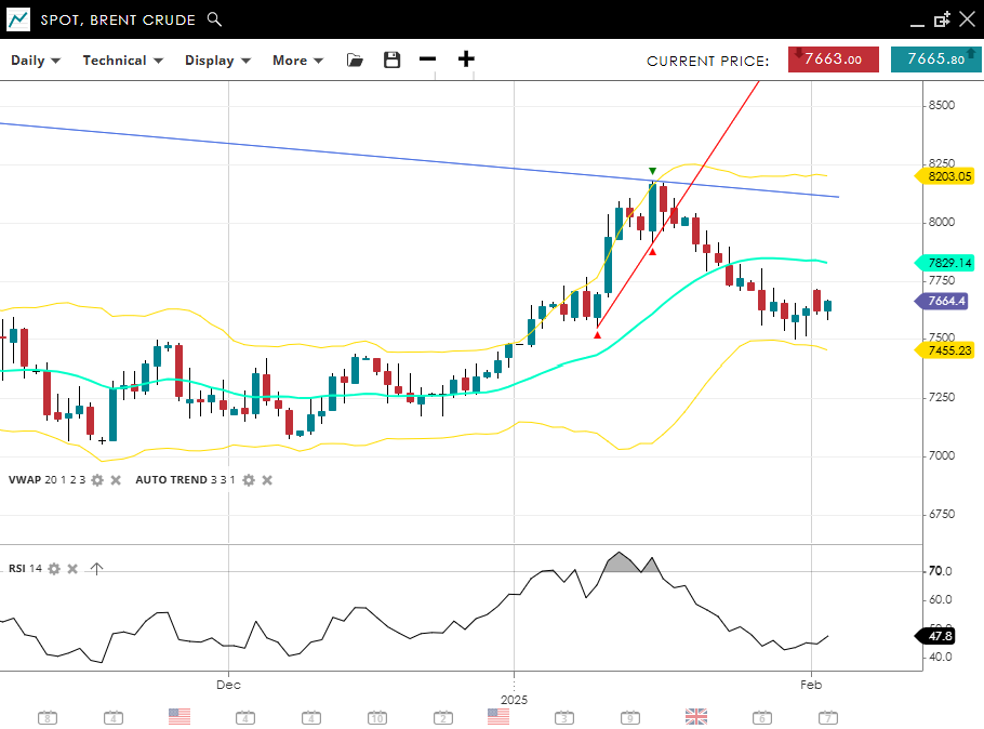 Brent Crude is undergoing a corrective phase within its broader bullish trend, currently trading at 7,664, below the VWAP (20) of 7,829. Support sits at 7,455, while resistance is at 8,203. With RSI at 47, momentum is neutral, indicating that the correction phase may continue before a potential resumption of the bullish trend.