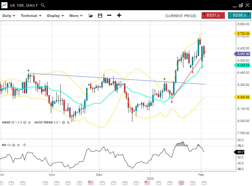 The UK 100 remains in an aggressive bullish impulsive move but has sustained a sharp correction over the weekend. Price is at 8,557, surpassing its VWAP (20) of 8,463. The nearest support is located at 8,200, while resistance is defined at 8,726. An RSI reading of 59 confirms continued positive momentum, with upside potential still in play.