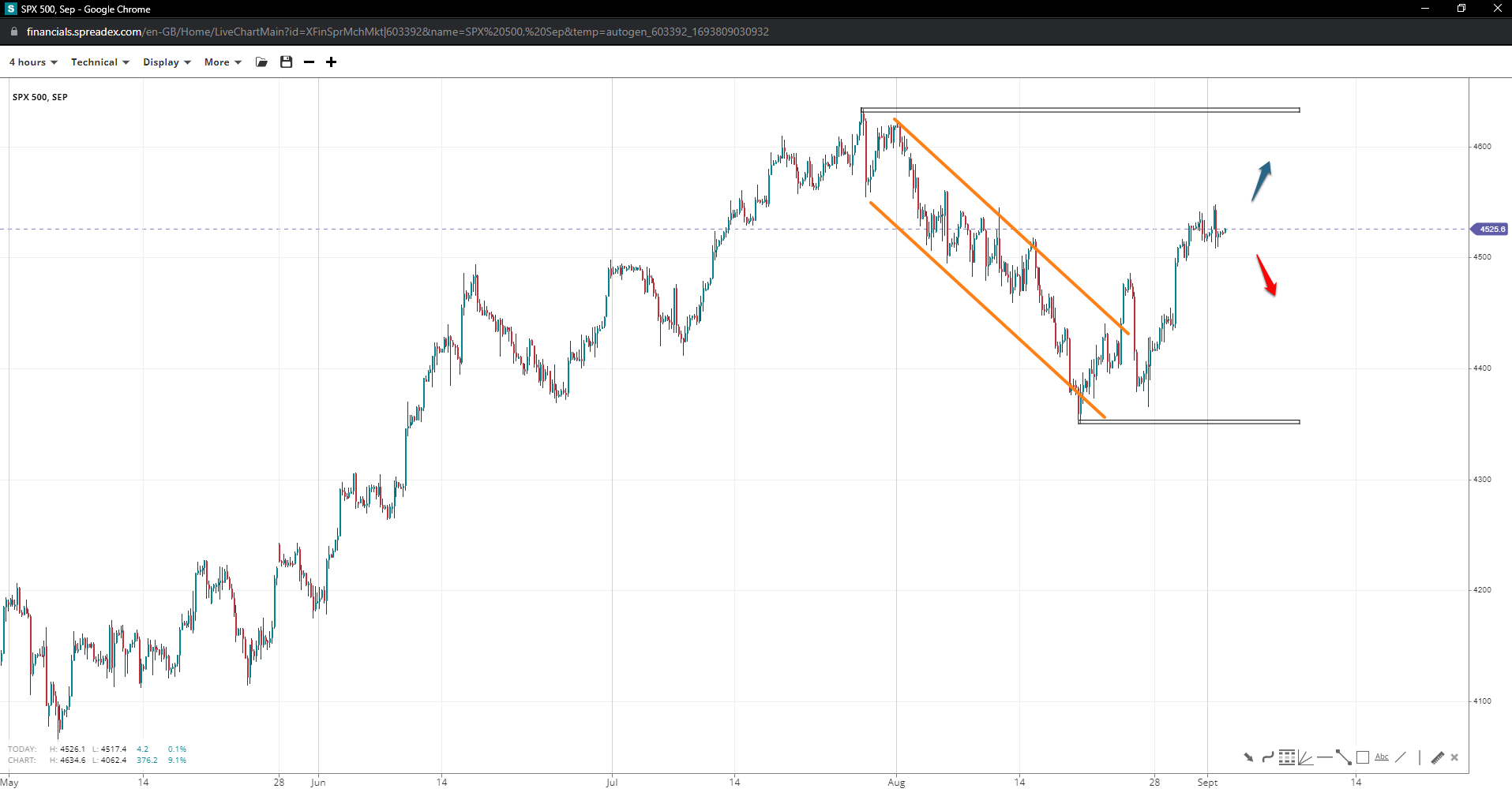 The bottom at 4350 might have completed a flag pattern, opening up 4635 again and perhaps new 2023 highs. If bulls lose 4485, chances of breaking lower will increase.