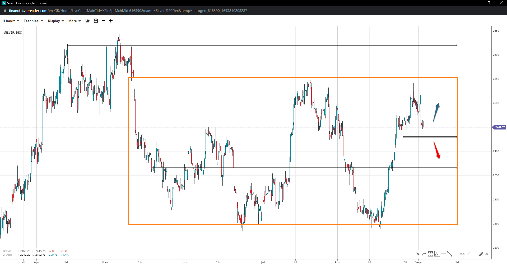 The upside spike in Silver suggests the top is now in, with chances of forming a range between $22.50 and 25.50 an ounce increasing. If bulls reclaim the peak, we might see a leg towards $26.20/oz. Conversely, falling under $24.30/oz may send prices to 23.60/oz.