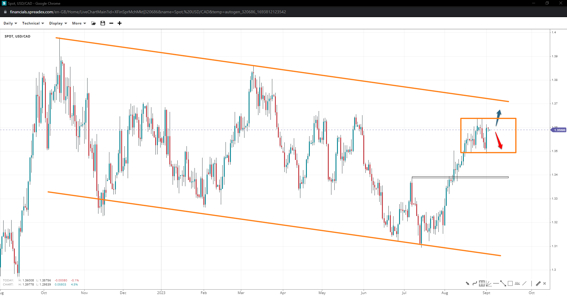 With $1.35 forming a double-bottom formation, bulls may target the $1.37 barrier next, where the top trendline of a long-term flag may offer rejection. Failing to get through the local top of $1.36640 could lead to a range, with the failure of the double-bottom opening up $1.34.