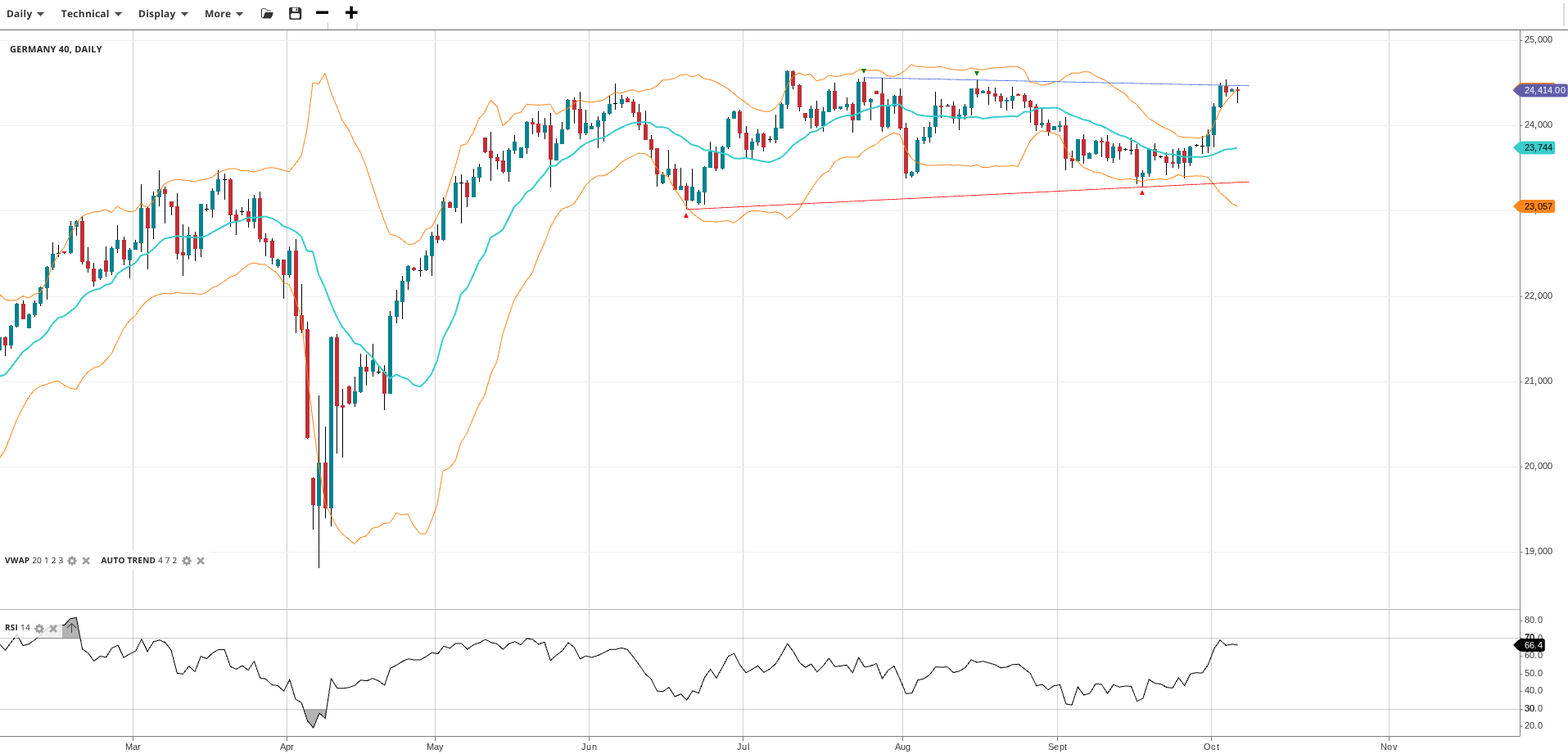 Germany 40 is testing the top of its sideways trend in a new impulsive phase that looks set to be followed by a breakout. Price is trading at 24,414, significantly above its VWAP of 23,744. The RSI at 66.4 indicates upward momentum. Support lies at 23,057 with resistance at 24,500.