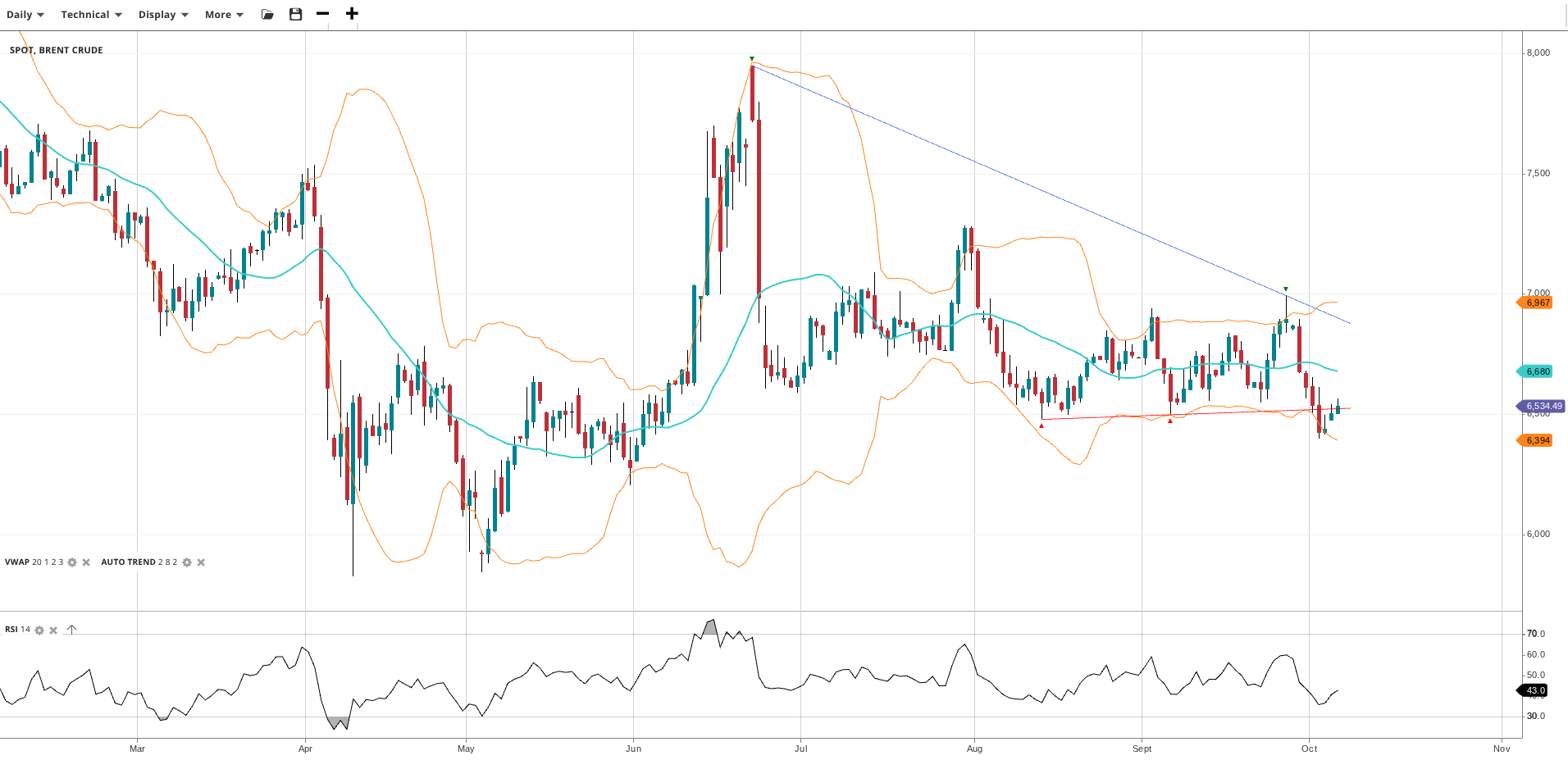 Brent Crude remains in a neutral range phase, trading at 6,535 just below its VWAP of 6,680. The RSI at 43.0 suggests a lack of buying pressure. Support is at 6,394, while resistance is higher at 6,967.