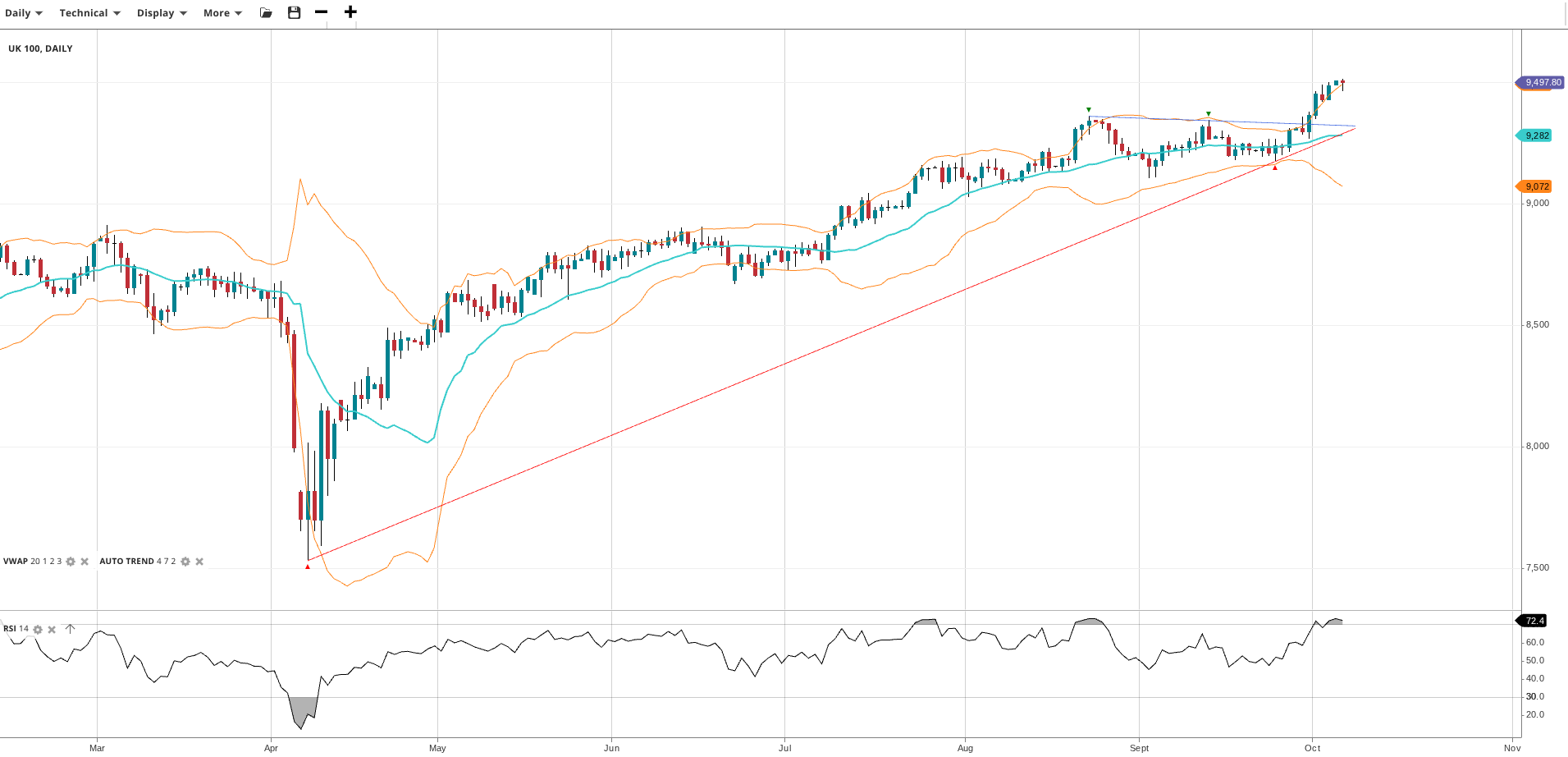 The UK 100 has broken out with a fresh leg into record highs, continuing its bullish trajectory. Price is at 9,498, clearly above the VWAP at 9,282. The RSI at 72.4 shows strong momentum, in overbought territory. Support is at 9,072 and resistance aligns with the current price.