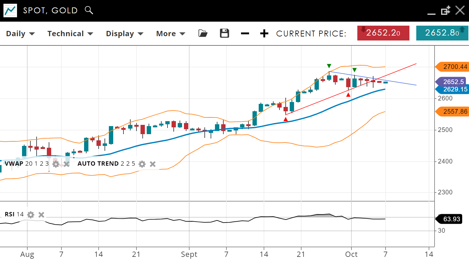 Gold continues to trend upward but has entered a corrective phase - more via time than price, which has stayed in a tight range, currently at  2,652, just above the VWAP (20) of 2,629. Support is found at 2,557, while resistance is at 2,700. The RSI of 63 indicates strong bullish momentum, although a potential slowdown could occur.