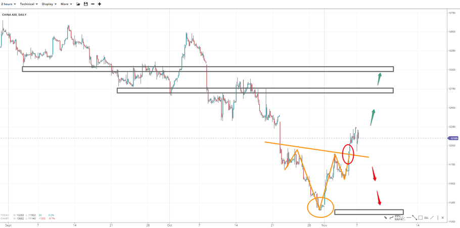China 50 appears to be on an upside move following the completion of an inverse head-and-shoulders pattern. The rejection at the 12k handle could lead the price to 12750 next if 12250 gives in, and perhaps the 13k handle. Otherwise, the right-shoulder low at 11570 could be the last stronghold above 11150 low, which is the head.
