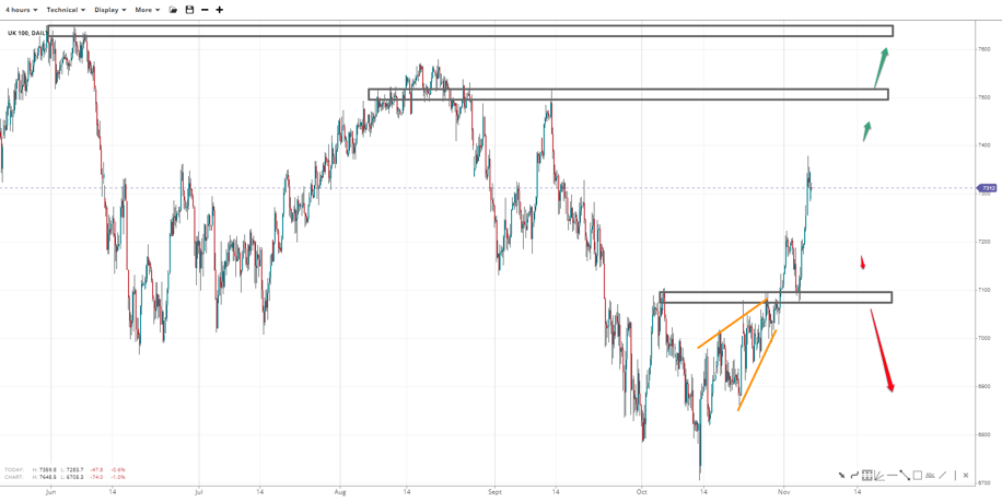 UK 100 reached a high of 7380, above the rising wedge target identified last week. 7100 is the primary support bulls need holding if the index turns down, with the 7200 a short-term floor. If the top breaks, 7500 and 7650 could be revisited after a possible consolidation.