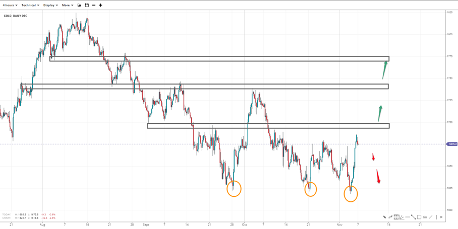 Gold has tested the 1625 low three times now, forming decent support. If bulls recapture the 1700 handle, 1740 is the next resistance, with 1780 as a last resort to the top side. If prices fail to surpass the ceiling and fall towards 1650, the chances of breaking the triple bottom at 1625 will increase.