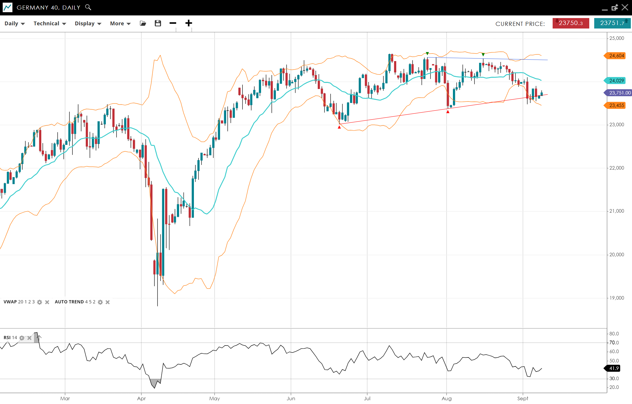 Germany 40 remains range-bound at 23,751, trading under its VWAP of 24,029. RSI at 42 signals weaker momentum. Support at 23,455 is being tested while resistance is 24,604.