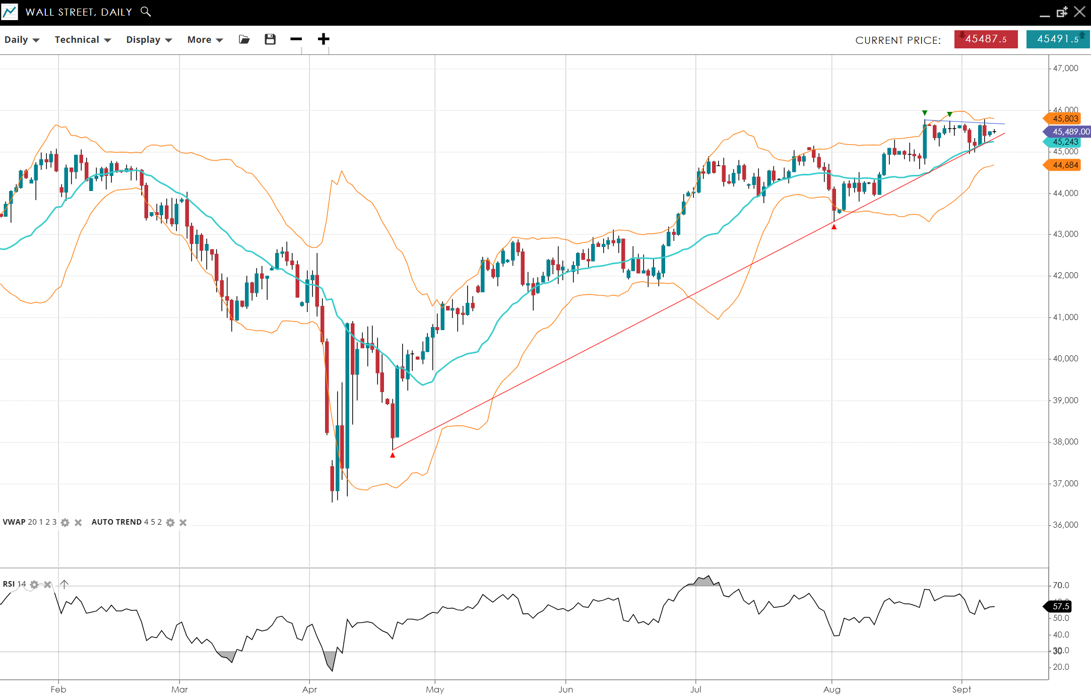 Wall Street continues in a bullish trend, consolidating below record highs, last at 45,487 above its VWAP of 45,243. RSI at 58 leans bullish. Support is 44,684, resistance 45,803.