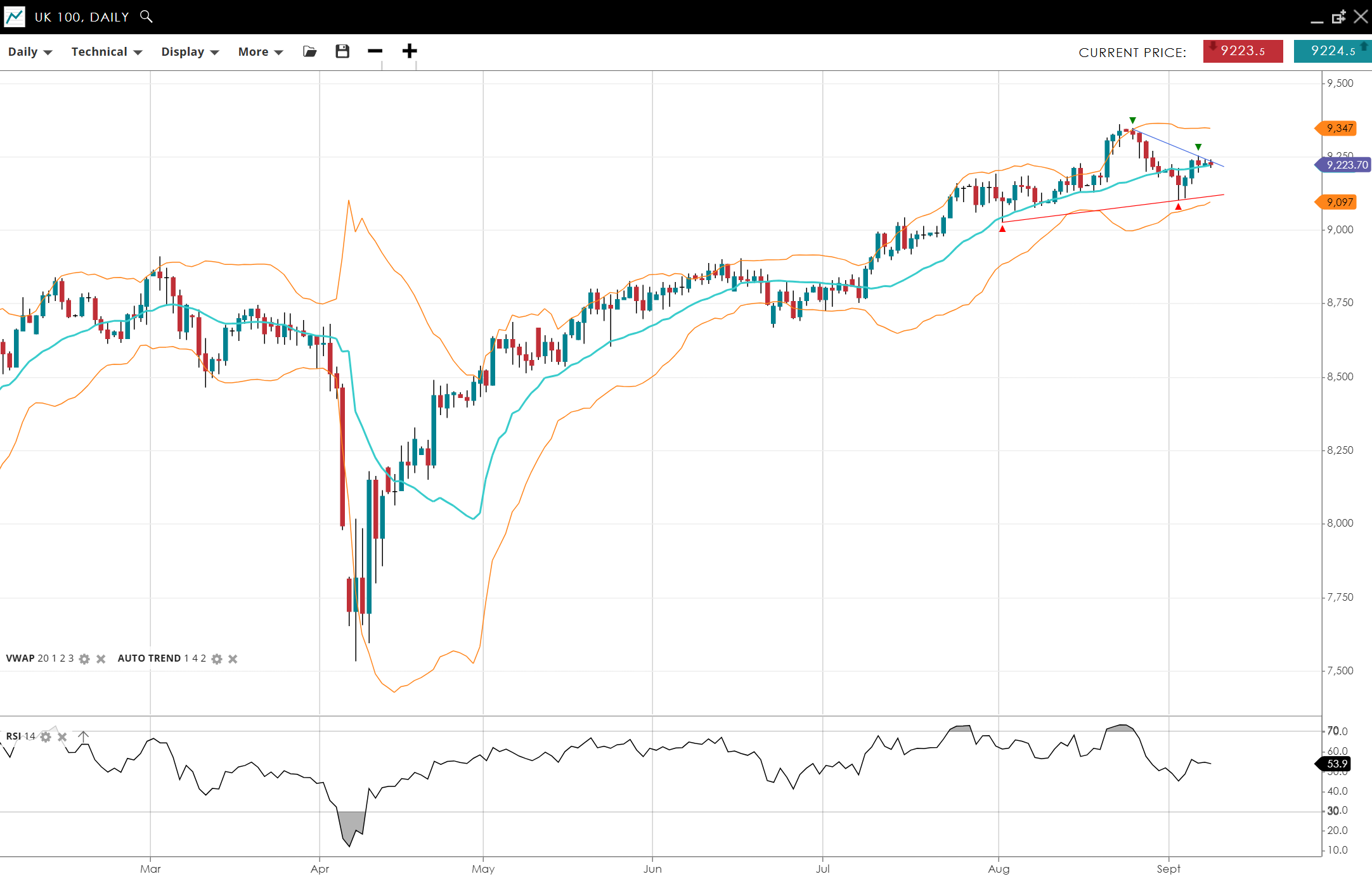 UK 100 remains bullish but has pulled back from recent highs down to its VWAP, trading at 9,224. RSI at 54 shows neutral-to-positive momentum. Support is 9,097, resistance is 9,347.