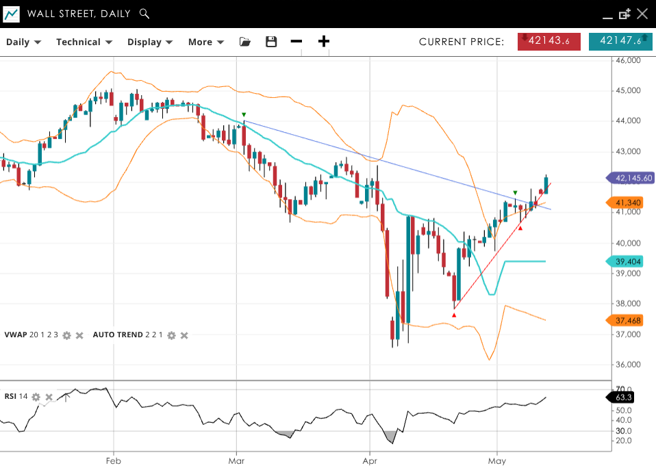 Wall Street is now bullish and impulsive, trading at 42,145.6 and well above its VWAP of 39,404. With RSI at 63.3 and price above resistance at 41,340, sentiment remains positive. Initial support is lower at 37,468.