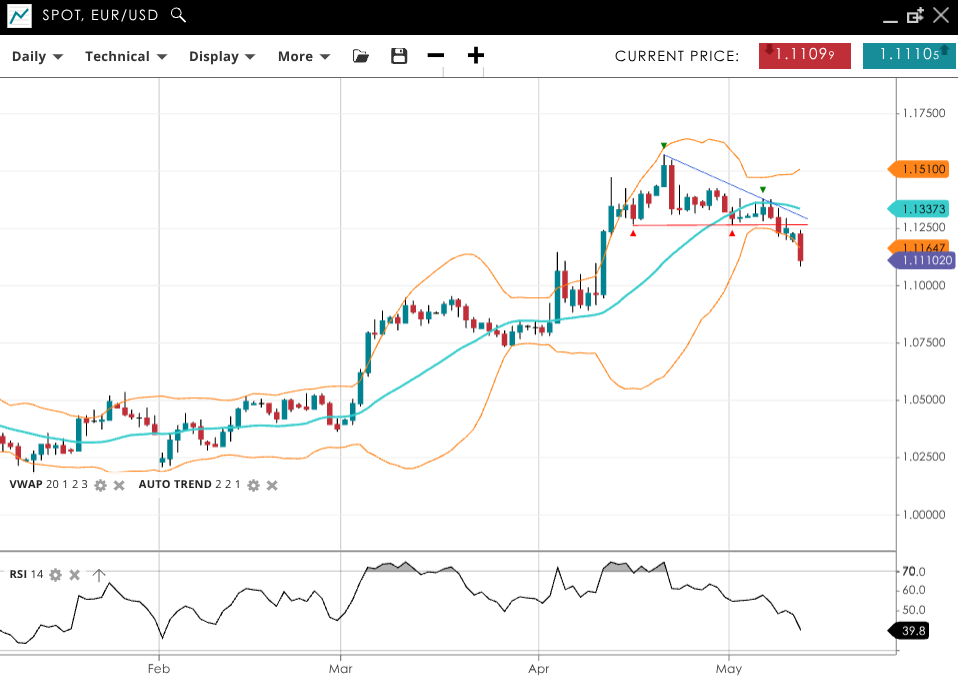 EUR/USD is now starting to trend bearish and in an impulsive move lower, trading at 1.1110, below the VWAP of 1.1337. RSI at 39.8 points to negative momentum. Support is at 1.1167, with resistance higher at 1.1510.