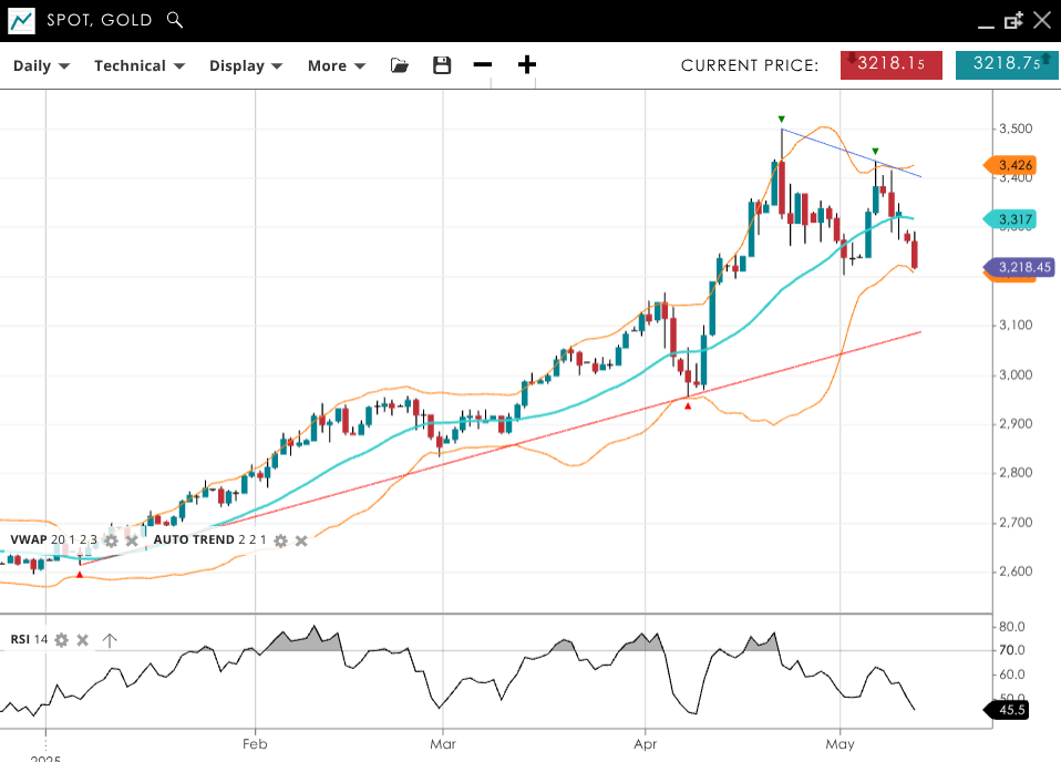 Gold has entered a correction phase within a broader bullish trend and could be about to see a bearish trend reversal. It trades at 3,218.4, now below its VWAP of 3,317. RSI at 45.5 confirms fading momentum. Support is seen at 3,200 and resistance at 3,426.