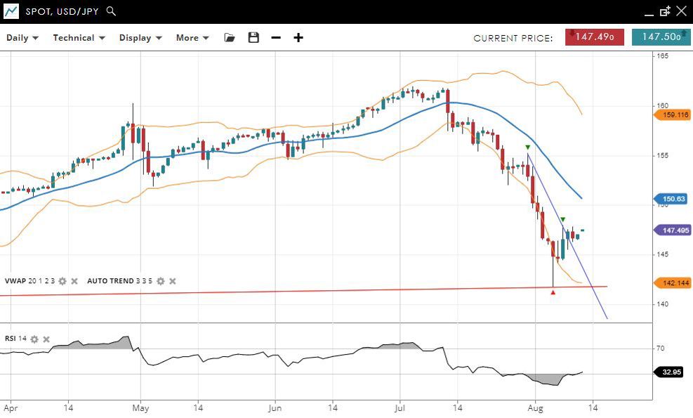 USD/JPY is in a bearish trend, continuing in an impulsive phase, with the price falling significantly to 147.49, now below the VWAP of 150.63. Support has been adjusted upward to 142.14, while resistance has increased to 159.11. The RSI has dropped sharply to 32, indicating a strong bearish momentum.
