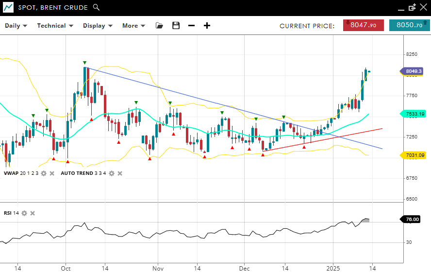 Brent Crude has made a swift transition into a bullish impulsive phase, trading strongly at 8049, well above the VWAP (20) of 7533. Support is set at 7031, and resistance is at 8040. The RSI at 76 points to overbought momentum, adding confirmation to the bullish trend.