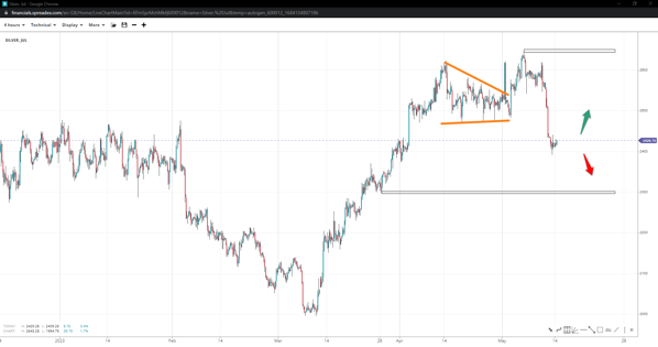 Wall Street might have put a pennant in at the 33100 support unless prices fall under 32930. In that event, the right shoulder of a potential H&S may form down at 32500. Otherwise, a move past 33780 will bring 34k and the high of 34100 back on the bulls’ radar.