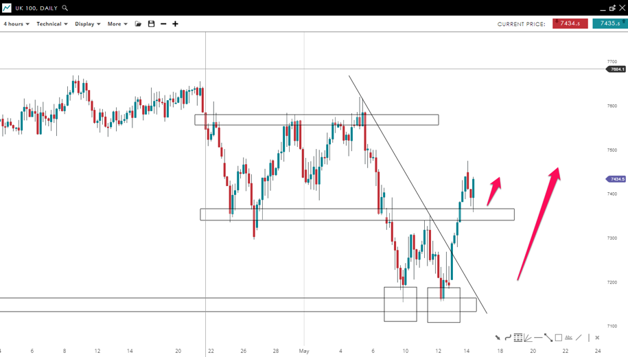The price of GER40 tested the 13,560 level (April low) and reversed higher and broke a bearish trendline to the upside. In addition, the bulls successfully broke and closed above the 13,900 round number, which could lead to a further move upwards towards 14,300 if the buyers will continue to control the market.