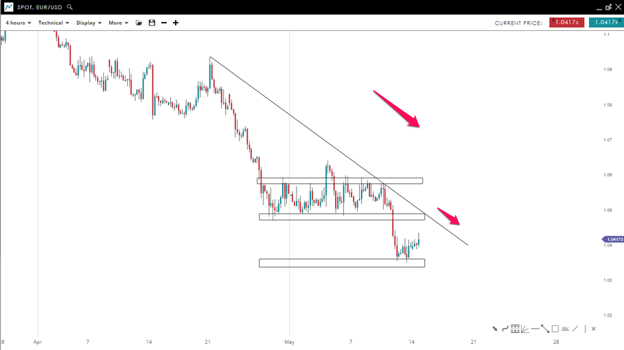 The euro succeeded to break the parallel channel to the downside with the help of a big bodied bearish bar. The price is posting a correction higher, where it might find sellers around the area of confluence made by the bearish trend line and the strong resistance level (1.0500). This could lead to a move lower again to the recent low at 1.0350.