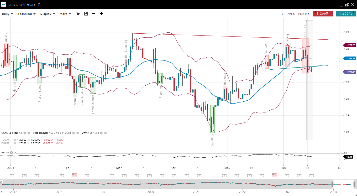 EUR/USD remains broadly trendless with the price more recently decreasing to 1.0706, now below the VWAP of 1.0812 - and indicating a possible new phase of weakness. Support has adjusted lower to 1.0681, while resistance has increased to 1.0942. The RSI has decreased to 38, indicating a significant increase in bearish pressure compared to the previous report.
