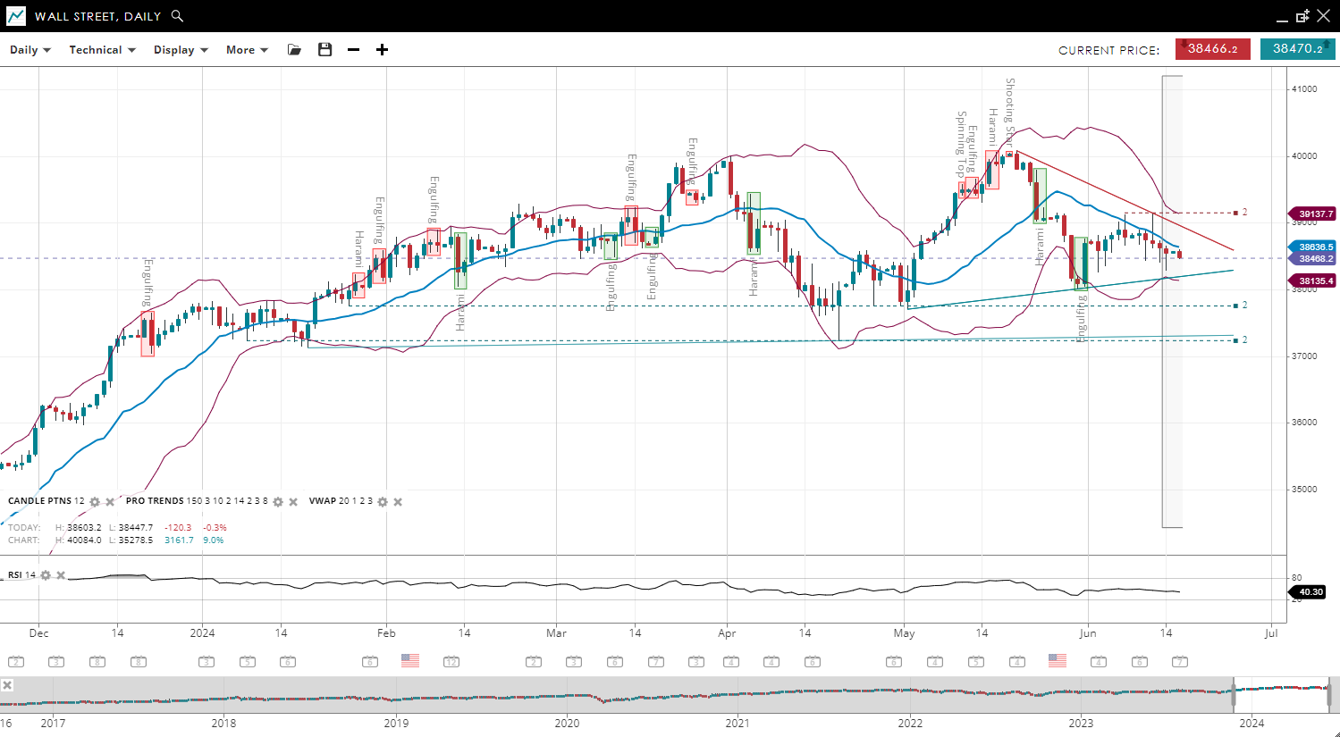 Wall Street has made no major upside or downside progress in the past 3 months - remaining in a neutral consolidation phase, with the price recently decreasing to 38,468, now below the VWAP of 38,636. Support and resistance levels have adjusted to 38,135 and 39,137, respectively. The RSI has slightly decreased to 40, signalling a reduction in bullish momentum compared to the previous report.