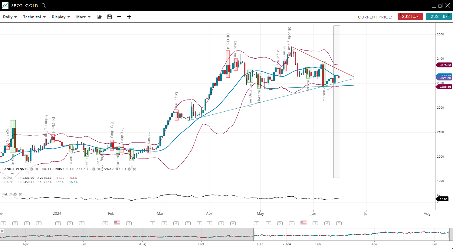 Gold is trading sideways in a neutral consolidation since topping in mid-April, with the price recently increasing to 2,321, now around the previous VWAP of 2,322. Support has adjusted higher to 2,286, while resistance has decreased to 2,375. The RSI has increased to 47, indicating a moderation of bearish momentum compared to the previous report.