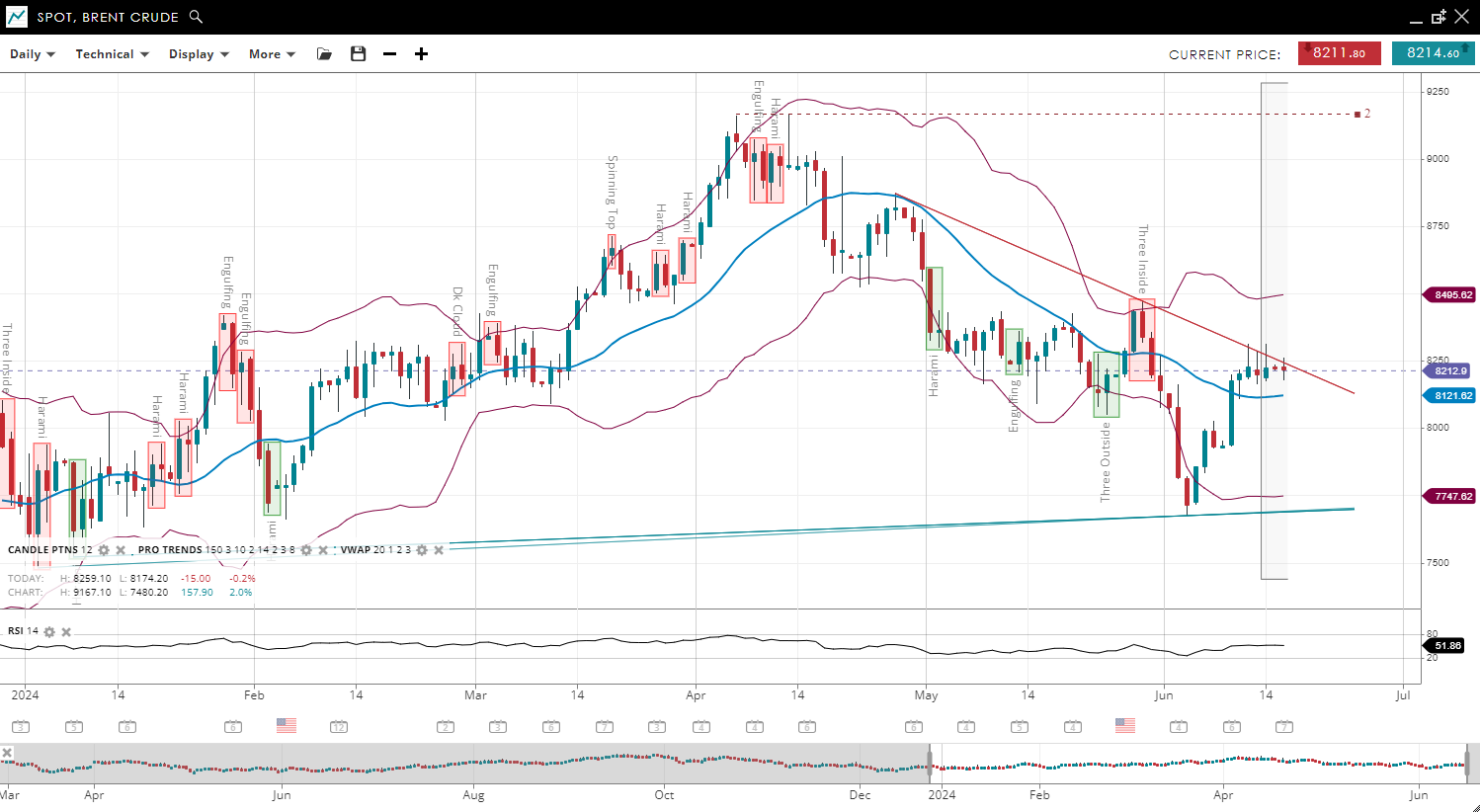 Brent Crude remains in a bearish trend and continues in an impulsive phase, with the price increasing to 82.12 and probing the April lows and 75.00, now above the VWAP of 81.21. Support has adjusted higher to 77.47, while resistance has increased to 84.95. The RSI has increased to 51, indicating a strengthening of bullish momentum compared to the previous report.