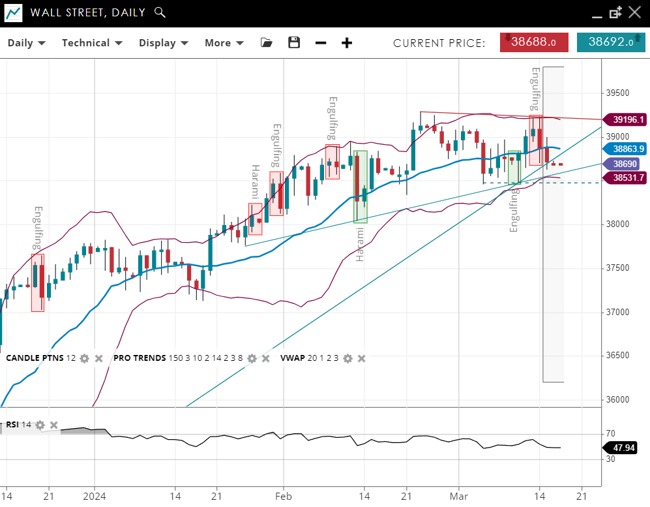 Wall Street is still in a bullish trend but is now in a corrective phase, with the price adjusting to 38,696, slightly below the upward-sloping 20-period VWAP of 38,863. The index's support is at 38,532, with resistance determined at 39,195. The RSI is at 48, reflecting a neutral momentum state.