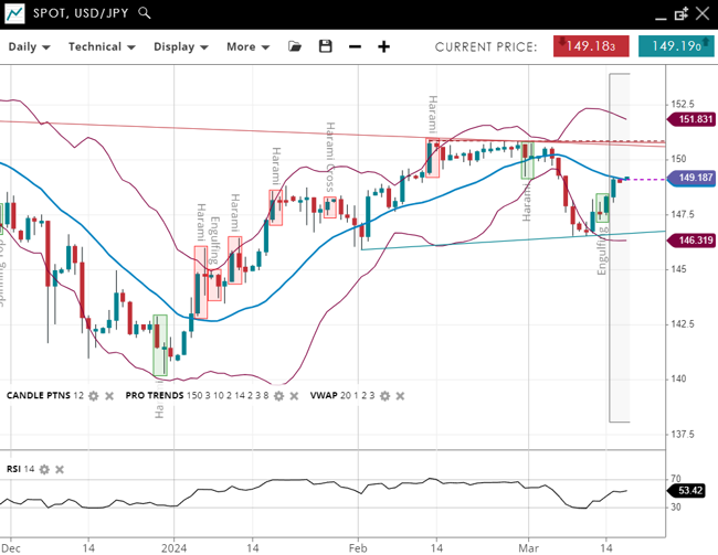 USD/JPY is still in a bearish trend, recently entering the corrective phase, with its price at 149.22, marginally above the 20-period VWAP of 149.18. The support has been revised down to 146.32, with resistance at 151.83. The RSI at 53 indicates a shift toward neutral momentum from previous bearish sentiment.