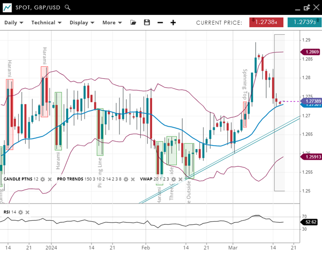 EUR/USD remains in a bullish trend and just about in the impulsive phase, with its price at 1.0900, marginally above its upward-sloping 20-period VWAP of 1.0879. The support is now at 1.0786, with resistance at 1.0972. The RSI at 54 indicates a stable positive momentum.