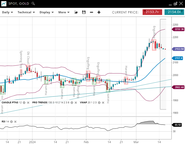 Gold is still in a bullish trend but is paying within what is still an impulsive phase, with the price adjusting to 2,153, which is comfortably above the 20-period VWAP of 2,117. The support level has been revised to 2,002, with resistance now at 2,232. The RSI has decreased to 65, still reflecting strong bullish sentiment.