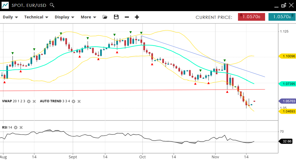 EUR/USD remains in a bearish, impulsive trend, trading at 1.0570, well below the VWAP (20) of 1.07395. Support is nearby at 1.0469, with resistance much higher at 1.1009. The RSI at 32 indicates strong downward pressure, signalling limited potential for bullish reversals in the near term.