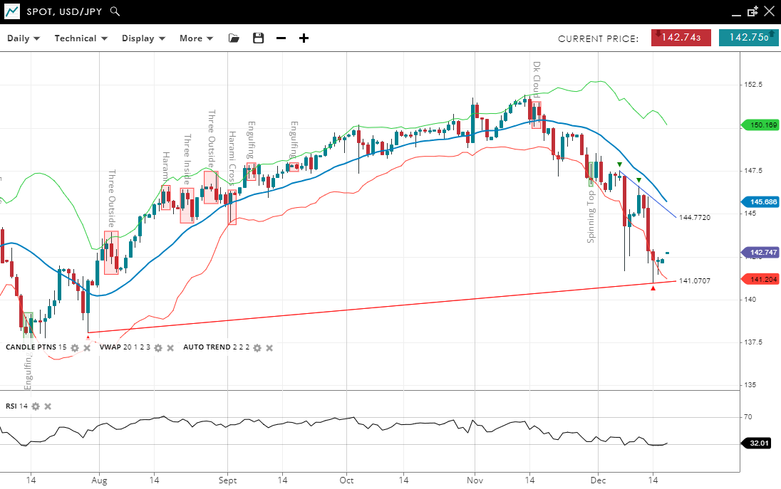 - Support appears firm at 141.20, while resistance is much higher at 150.17.