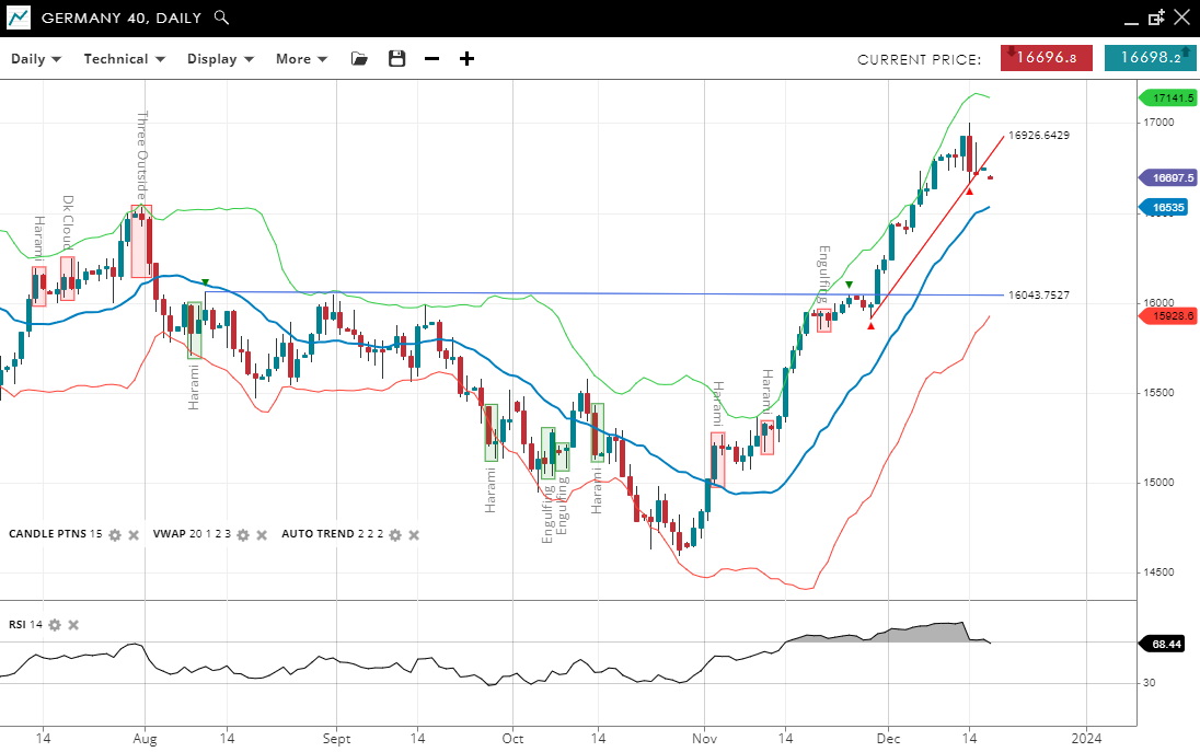 - The Germany 40 shows a bullish trend, near record highs with a rising VWAP at 16,535.